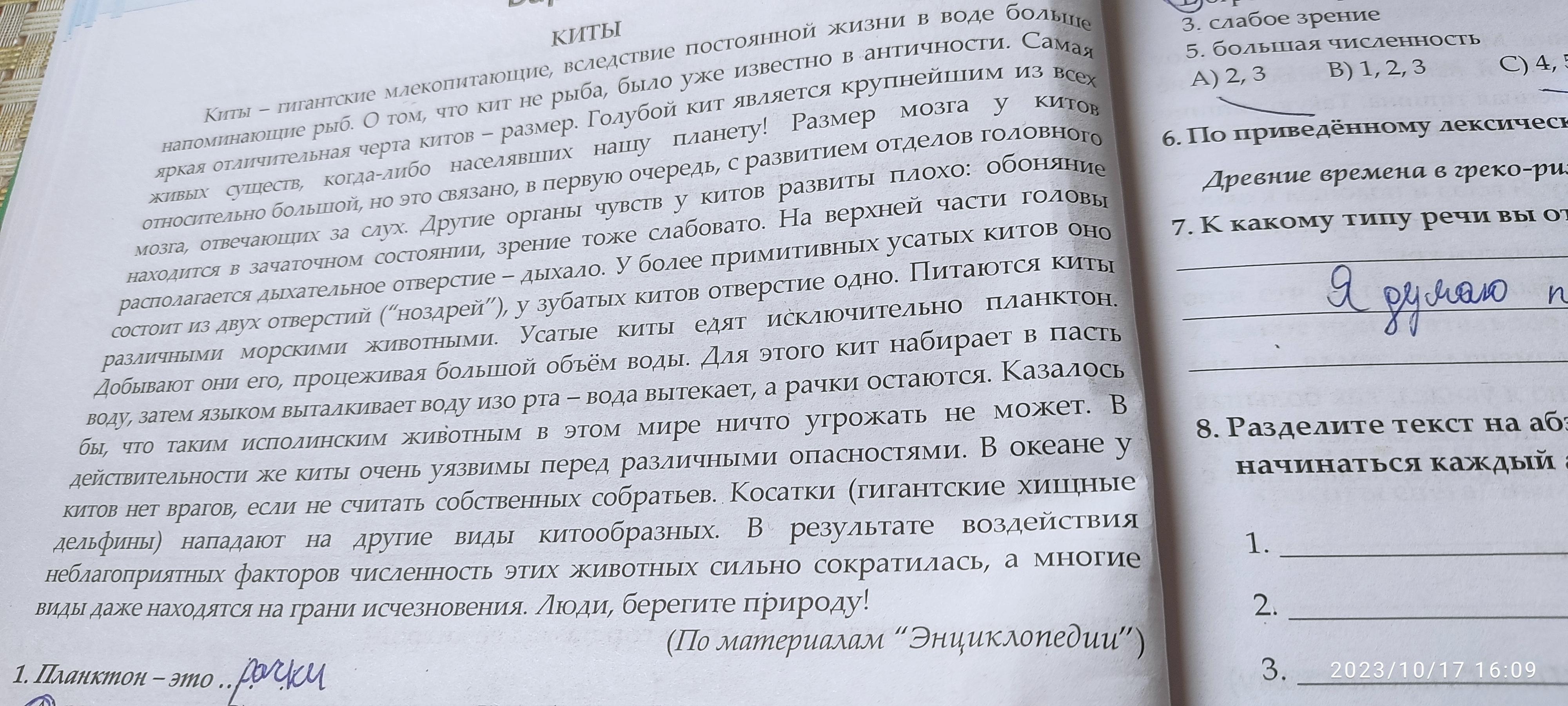 1.Киты-гиганские млекопитающие, вследствие постоянной жизни в воде больше напоминающие рыб.О том,что кит не рыба,было уже известно в античности.2.Самая яркая отличительная черта китов-размер.Голубой кит является крупнейшим из всех существ, когда либо населявших нашу планету!Размер мозга у китов относительно большой,но это связано в первую очередь,с развитием отделов головного мозга, отвечающих за слух.Другие органы чувств у китов развиты плохо:обоняние находится в зачаточном состояние,зрение тоже слабовато.На верхней части головы располагается дыхательное отверстие-дыхало.У более примитивных усатых китов оно состоит из двух отверстий "Ноздрей",у зубатых китов отверстие одно.3.Питаются киты различными морскими животными. Усатые киты едят исключительно планктон.Добывают они его,процеживая большой объём воды .Для этого кит набирает в пасть воду,затем выталкивают воду изо рта-вода вытекает,а рачки остаются.4.Казалось бы,что таким исполинским животным в этом мире ничто угрожать не может.В действительности же киты очень уязвимы перед различными опасностями .В океане у китов нет врагов ,если не считать собственных собратьев .Косатки (гигантские хищные дельфины ) нападают на другие виды китообразных.В результате воздействия неблагоприятных факторов численность этих животных сильно сократилась,а многие виды даже на грани исчезновения . Люди берегите природу!