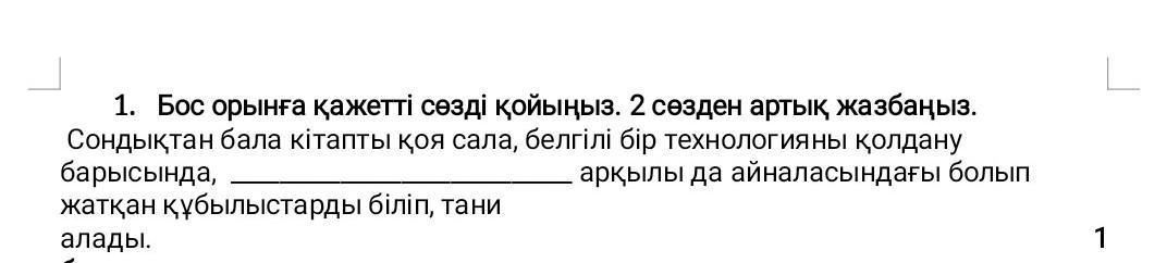 1. Бос орынға қажетті сөзді қойыңыз. 2 сөзден артық жазбаңыз. Сондықтан бала кітапты қоя сала, белгілі бір технологияны қолдану барысында, арқылы да айналасындағы болып жатқан құбылыстарды біліп, тани алады. 1