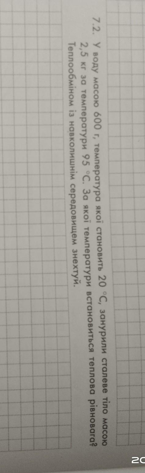 7.2. У воду масою 600 г, температура якої становить 20 °C, занурили стало масою 2,5 кг за температури 95 °С. За якої температури встановиться теплова рівновага? Теплообміном із навколишнім середовищем знехтуй.