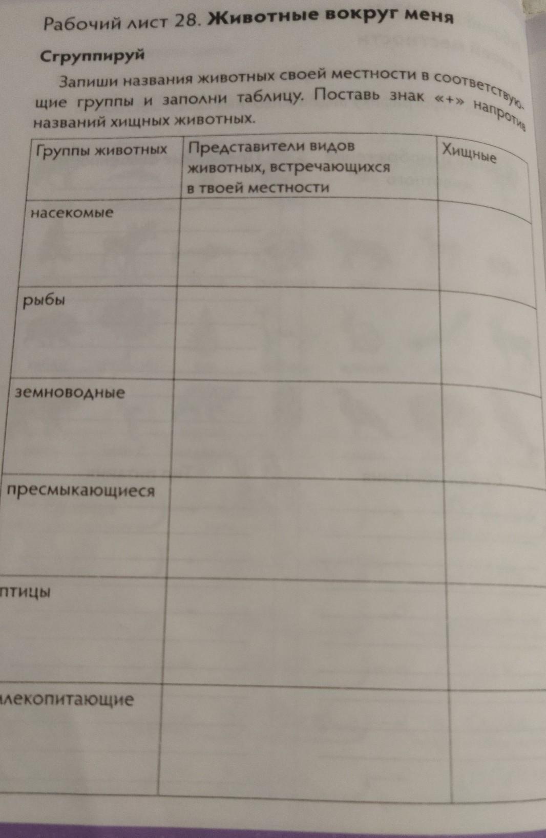 Рабочий лист 28. Животные вокруг меня Сгруппируй щие группы и заполни таблицу. Поставь знак ф>> напротив Запишм названия животных своей местности в соответствую названий хищных животных. Группы животных насекомые рыбы земноводные пресмыкающиеся птицы млекопитающие Представители видов животных, встречающихся в твоей местности Хищные
