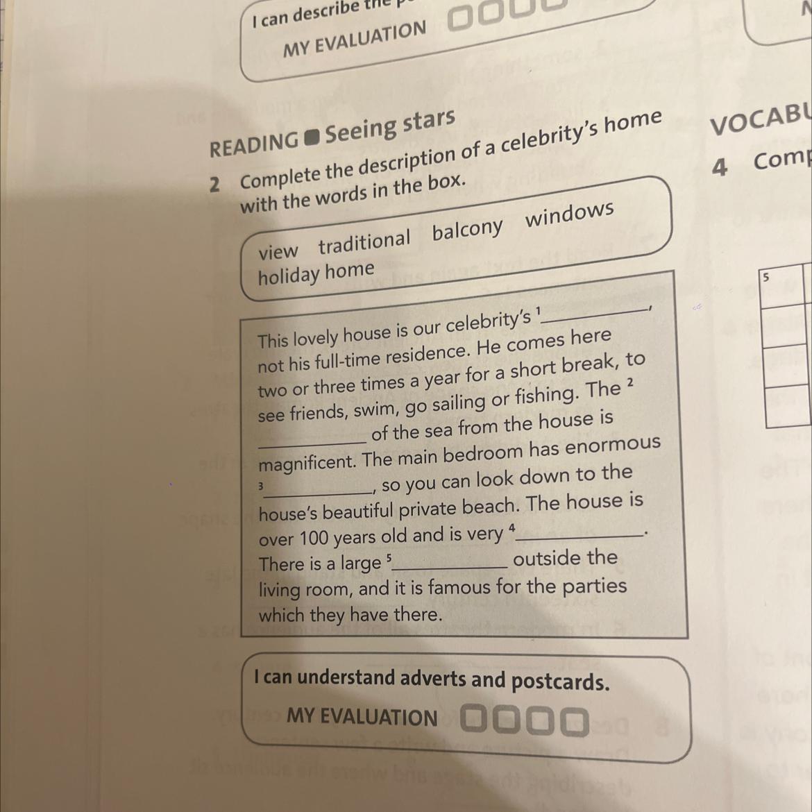 This lovely house is our celebrity's **holiday home**, not his full-time residence. He comes here two or three times a year for a short break, to see friends, swim, go sailing or fishing. The **view** of the sea from the house is magnificent. The main bedroom has enormous **windows**, so you can look down to the house's beautiful private beach. The house is over 100 years old and is very **traditional**. There is a large **balcony** outside the living room, and it is famous for the parties which they have there.
