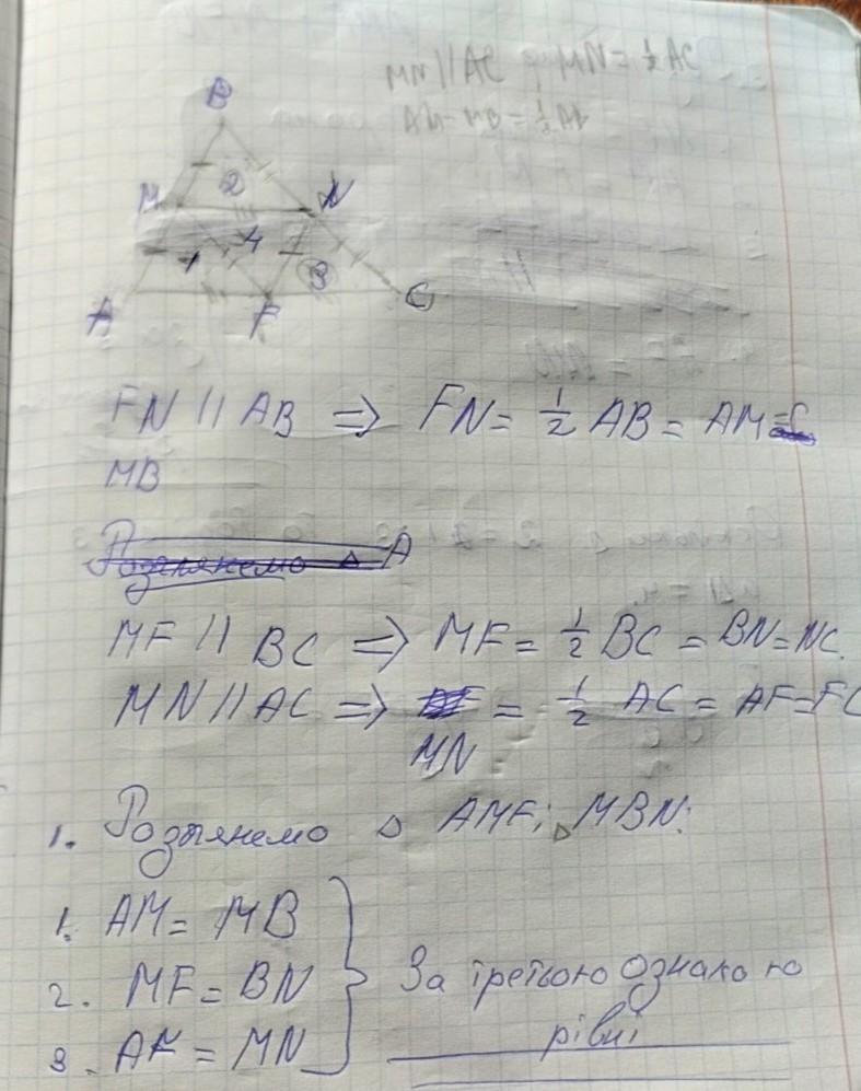 Доведіть, що середні лінії трикутника розбивають його на чотири рівних трикутники.