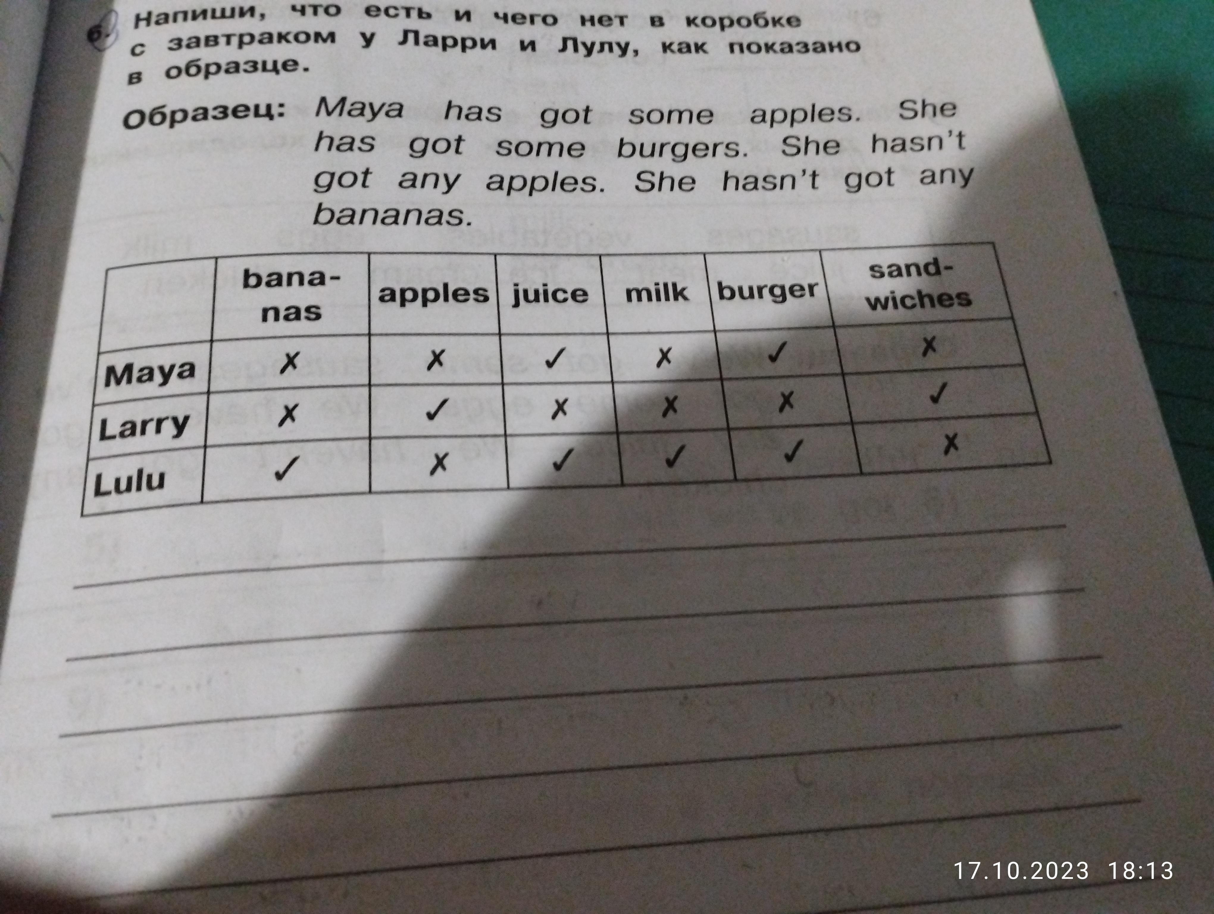 Напиши, что есть и чего нет в коробке с завтраком у Ларри и Лулу, как показано в образце. (Кто решит получит 10 баллов)