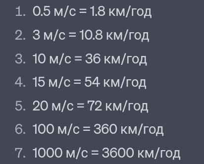 Подайте в кілометрах на годину такі значення швид- кості руху: 0,5 м/с, 3 м/с, 10 м/с, 15 м/с, 20 м/с, 100 м/с, 1000 м/с.