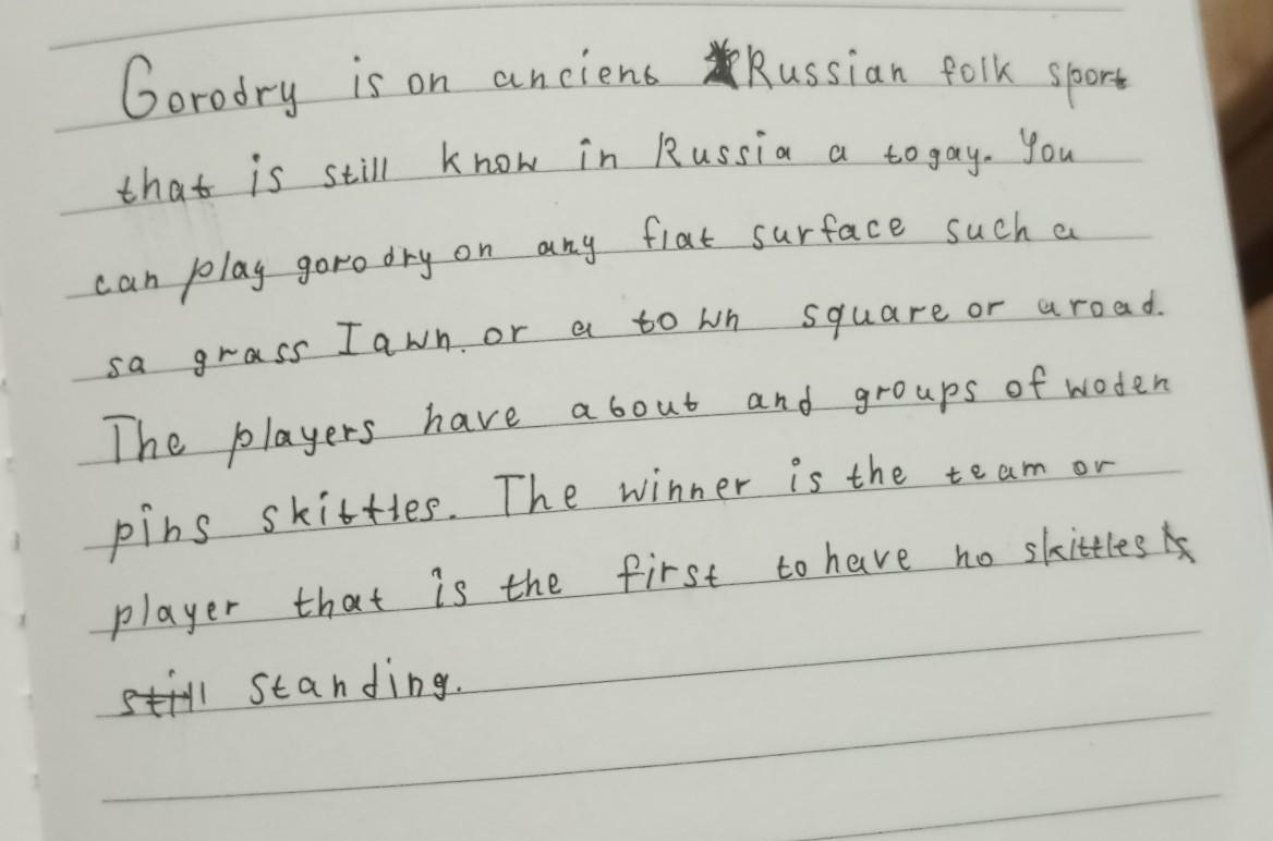 Городри (?) из эн эншент рашан Фок спорт зэт из Стил ноу ин Раша тудэй. Ю кэн плэй городри он эни флэт сёрфэйс сач э грэс (не понимаю что написано) ор э Таун сквэа ор а роуд. Зе плэирс хэв абаут Анд групс оф вуден пинс скитлс. Зе винна из Зе фёрст ту хэв ноу скитлс стэндин.