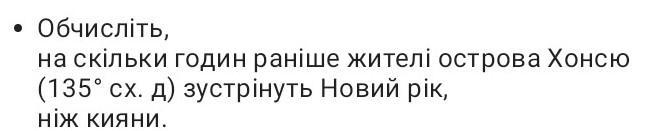 • Обчисліть, на скільки годин раніше жителі острова Хонсю (135° сх. д) зустрінуть Новий рік, ніж кияни.