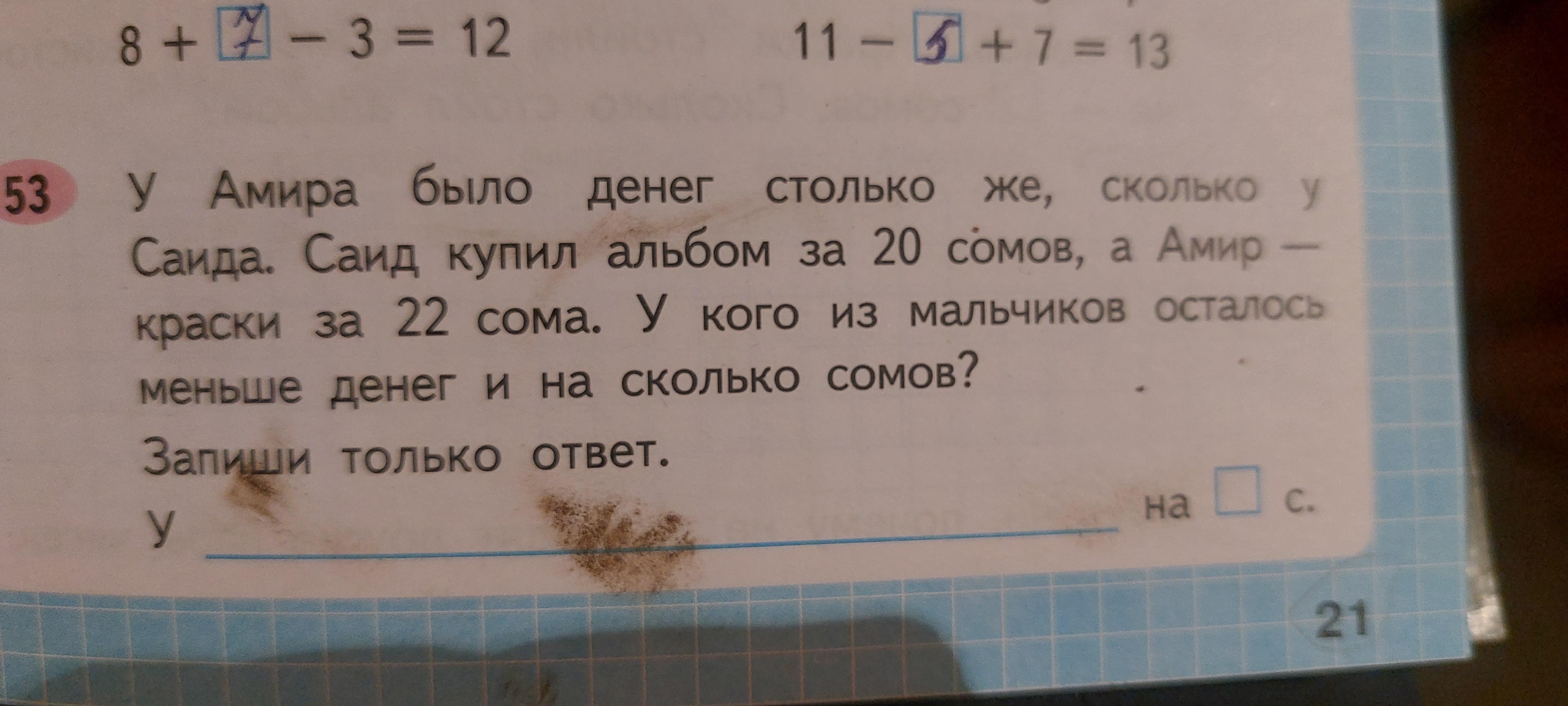 У них было допустим 50 сом, Саид потратил 20 сом и у него осталось 30 сом, а Амир потратил 22 сома и у него осталось 28 сома