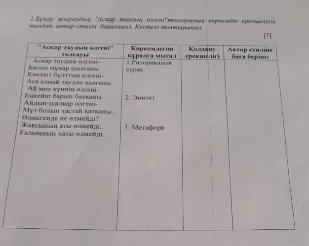 2.буқар жыраудың "асқар таудың өлгені"толгауының көркемдік ерекшелігін талдап, автор стилін бағалаңыз. кестені толтырыңыз.