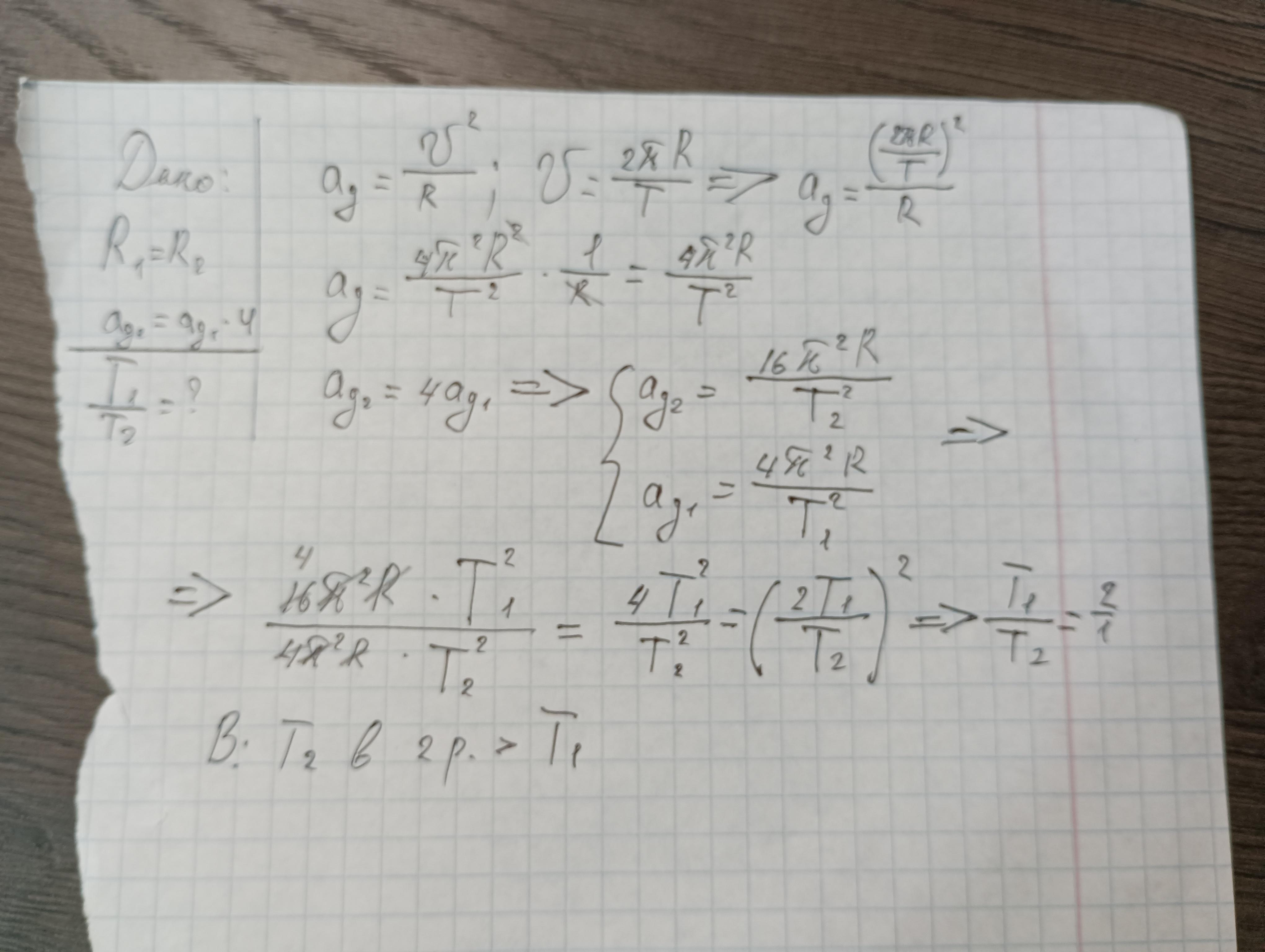 Два тіла рівномірно рухаються по колах однакового радіуса. Доцентрове прискорення другого тіла в 4 рази більше за прискорення першого. Порівняйте періоди обертання тіл.