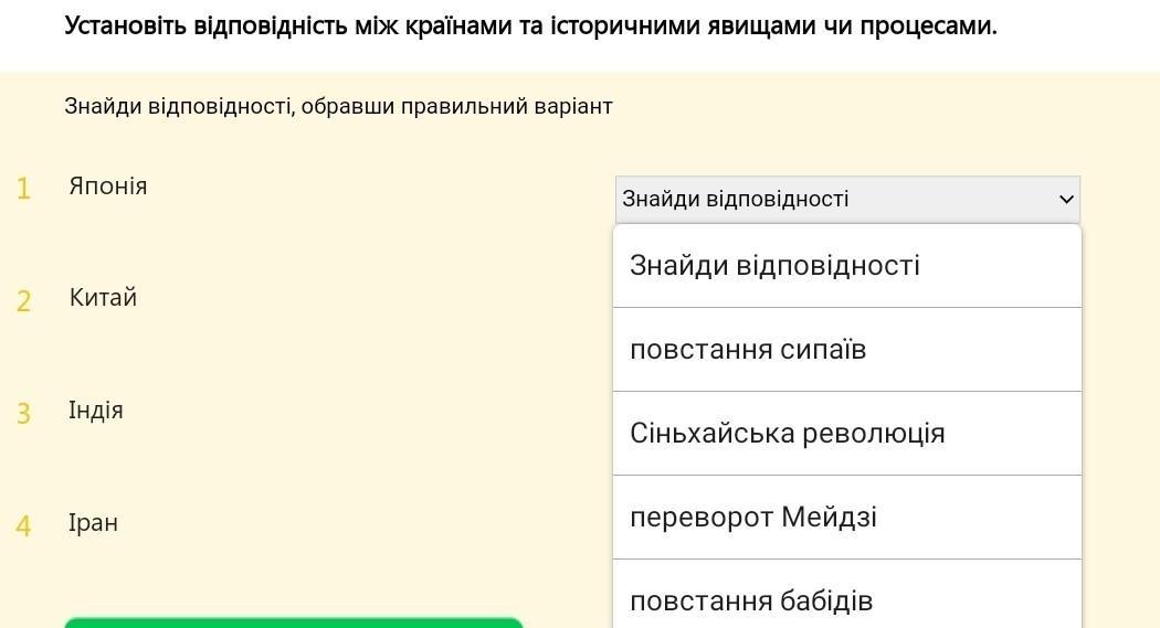 1 3 Установіть відповідність між країнами та історичними явищами чи процесами. 4 Знайди відповідності, обравши правильний варіант 2 Китай Японія Індія Іран Знайди відповідності Знайди відповідності повстання сипаïв Сіньхайська революція переворот Мейдзі повстання бабідів