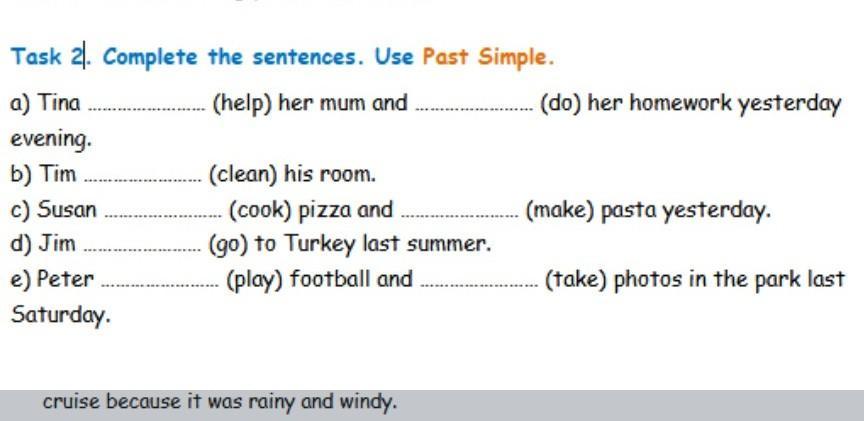 Task 2. Complete the sentences. Use Past Simple. a) Tina (help) her mum and............. evening. b) Tim c) Susan d) Jim e) Peter Saturday. (clean) his room. (cook) pizza and (go) to Turkey last summer. (play) football and …......... (do) her homework yesterday (make) pasta yesterday. (take) photos in the park last