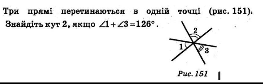 три прямі перетинаються в одній точці.Знайдіть кут 2, якщо кут 1+кут 3=126°