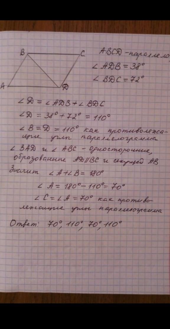 В параллеллограмме противоположные углы равны: ∠В=∠D=110°