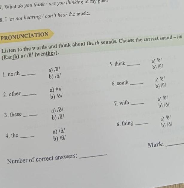 ПОМАГИТЕ ПОЖАЛУЙСТА ПОСТАВЛЮ САМЫЙ ВЫСОКИЙ БАЛЛ 5 PRONUNCIATION Listen to the words and think about the th sounds. Choose the correct sound - /0/ (Earth) or /d/ (weather). 1. north 2. other 3. these 4. the ➖ ➖➖ - a) /0/ b) /ð/ a) /0/ b)/8/ a) /8/ b)/0/ a) /8/ b)/0/ 5. think 6. south 7. with 8. thing. - a) /8/ b) /0/ a) /8/ b) /0/ a) /0/ b)/8/ a) /8/ b)/8/