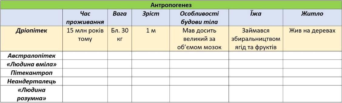Заповніть таблицю «Антропогенез», вписавши відомості у пусті віконця. Приклад виконання роботи представлений відомостями про дріопітеків.