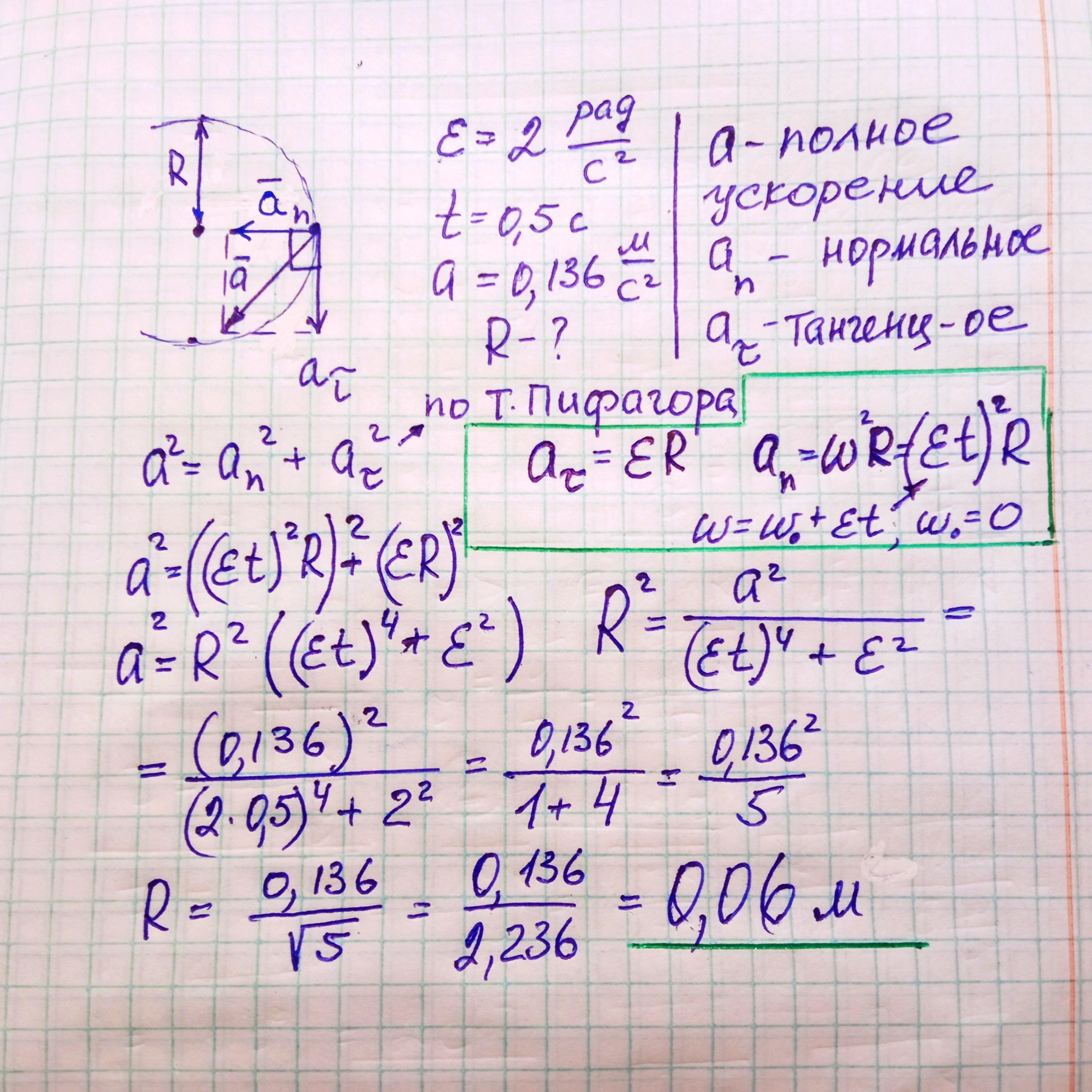Колесо обертається з кутовим прискоренням 2 рад/с². Протягом інтервалу часу 0,5 с від початку руху повне прискорення колеса дорівнює 13,6 см/с². Знайдіть радіус колеса.
