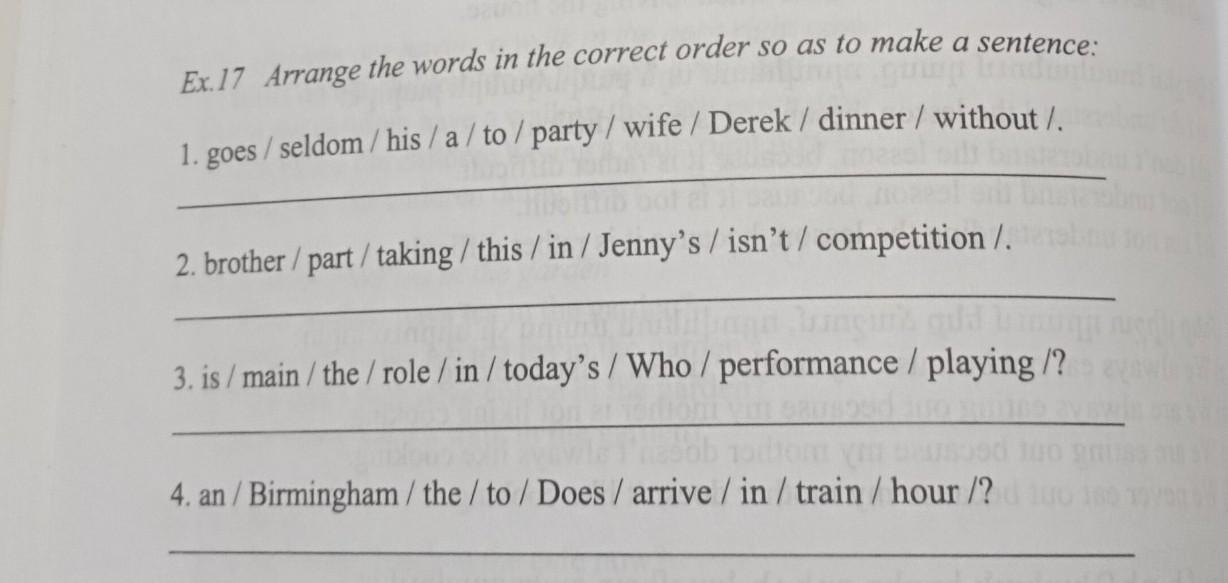 Ex.17 Arrange the words in the correct order so as to make a sentence: 1. goes / seldom/his/a/to/party/ wife/Derek / dinner / without /. 2. brother/part/ taking / this / in / Jenny's / isn't/ competition /. 3. is/main/the/role /in/today's / Who/performance / playing/? om y susood 4. an/Birmingham / the/to/ Does / arrive/in / train /hour/? how to