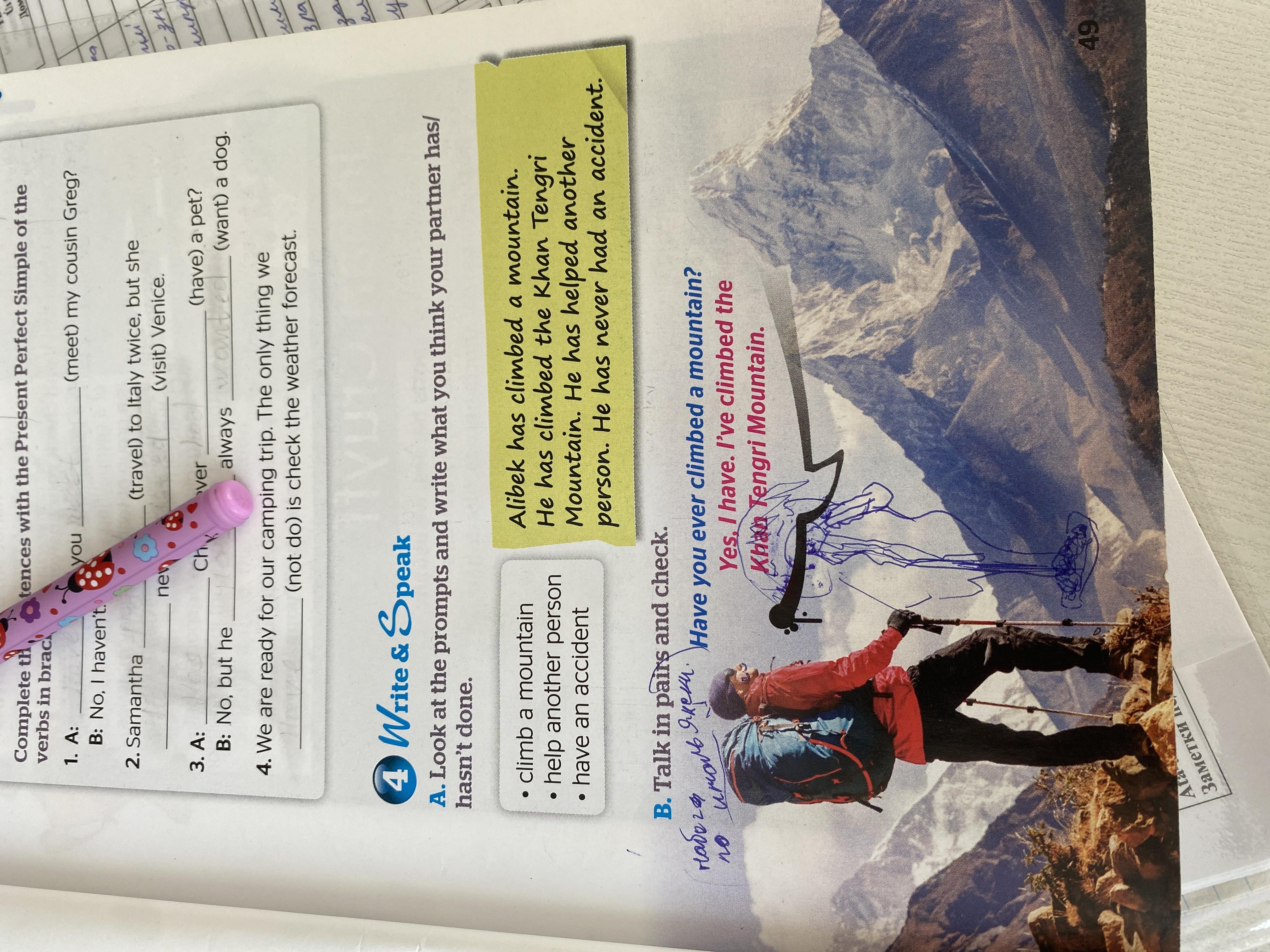 4Write & Speak A. Look at the prompts and write what you think your partner has/ hasn't done.Alibek has climbed a mountain. He has climbed the Khan Tengri Mountain. He has helped another person. He has never had an accident.B. Talk in pairs and check. набога по италь Have you ever climbed a mountain? Yes, I have. I've climbed the Khan Tengri Mountain.
