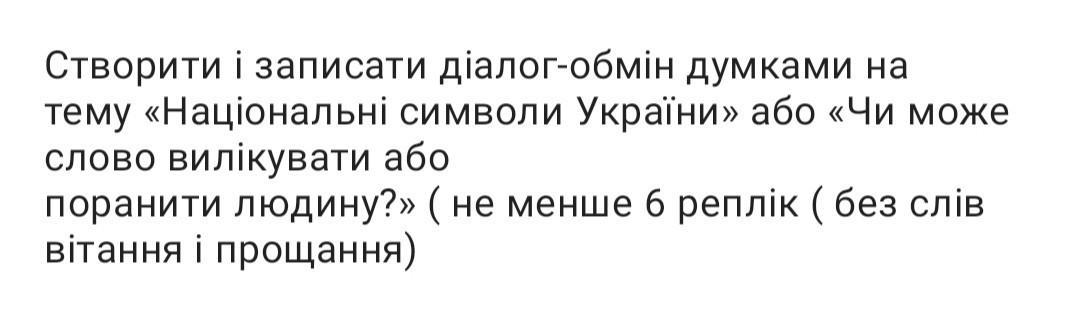 Створити і записати діалог-обмін думками на тему «Національні символи України» або «Чи може слово вилікувати або поранити людину?» ( не менше б реплік (без слів вітання і прощання)