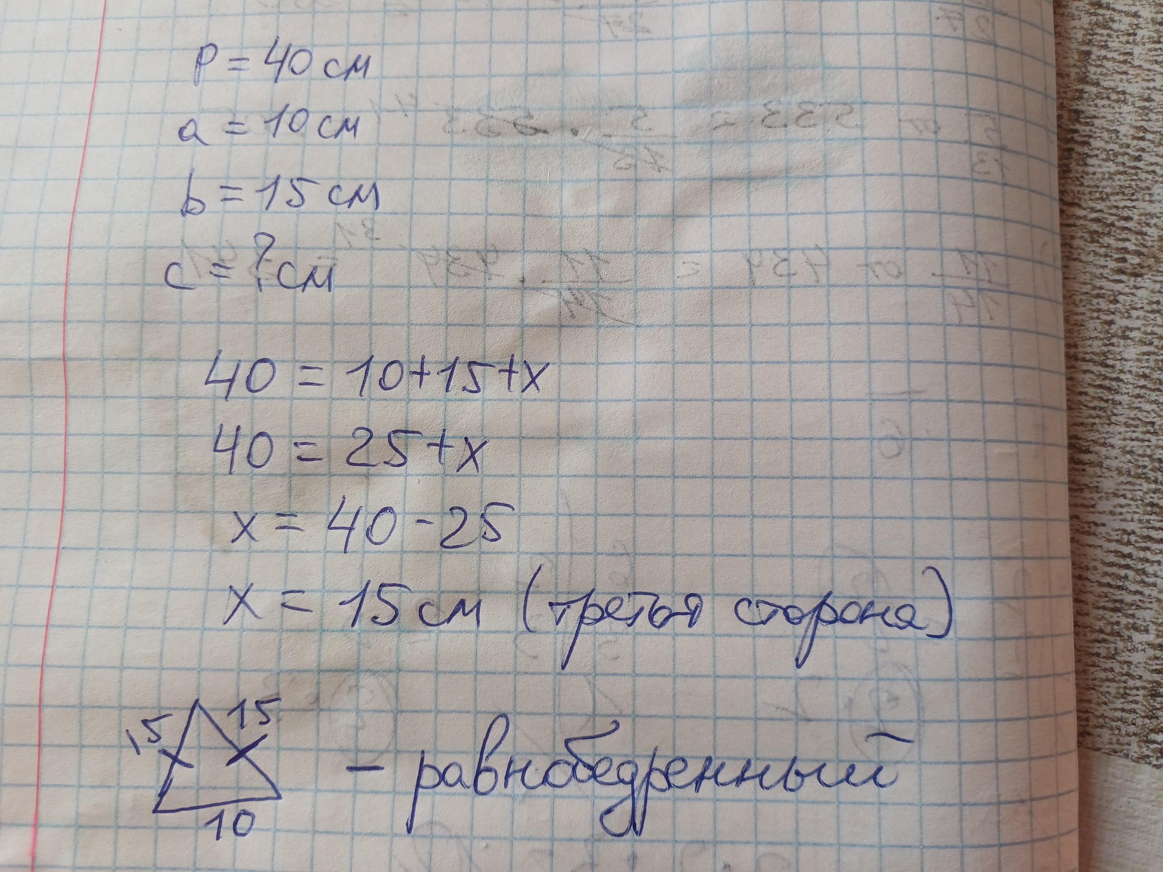 Периметр трикутника 40 см, а дві його сторони відповідно дорівнюють 15 см и 10 см. Знайти третю сторону трикутника.Визначити вид трикутника