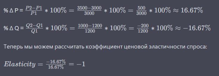 Для рассчета коэффициента ценовой эластичности спроса используется следующая формула: (на фото). Где: