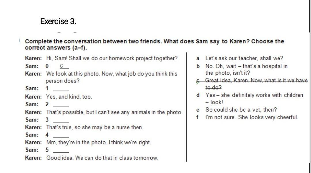 Exercise 3. Complete the conversation between two friends. What does Sam say to Karen? Choose the correct answers (a-f). Karen: Hi, Sam! Shall we do our homework project together? Sam: 0 с Karen: We look at this photo. Now, what job do you think this person does? Sam: 1 Karen: Yes, and kind, too. Sam: 2 Karen: That's possible, but I can't see any animals in the photo. Sam: 3 Karen: That's true, so she may be a nurse then. Sam: 4 Karen: Mm, they're in the photo. I think we're right. Sam: 5 Karen: Good idea. We can do that in class tomorrow. a Let's ask our teacher, shall we? No. Oh, wait - that's a hospital in the photo, isn't it? b Great idea, Karen. Now, what is it we have to do? d Yes - she definitely works with children - look! So could she be a vet, then? I'm not sure. She looks very cheerful. e f