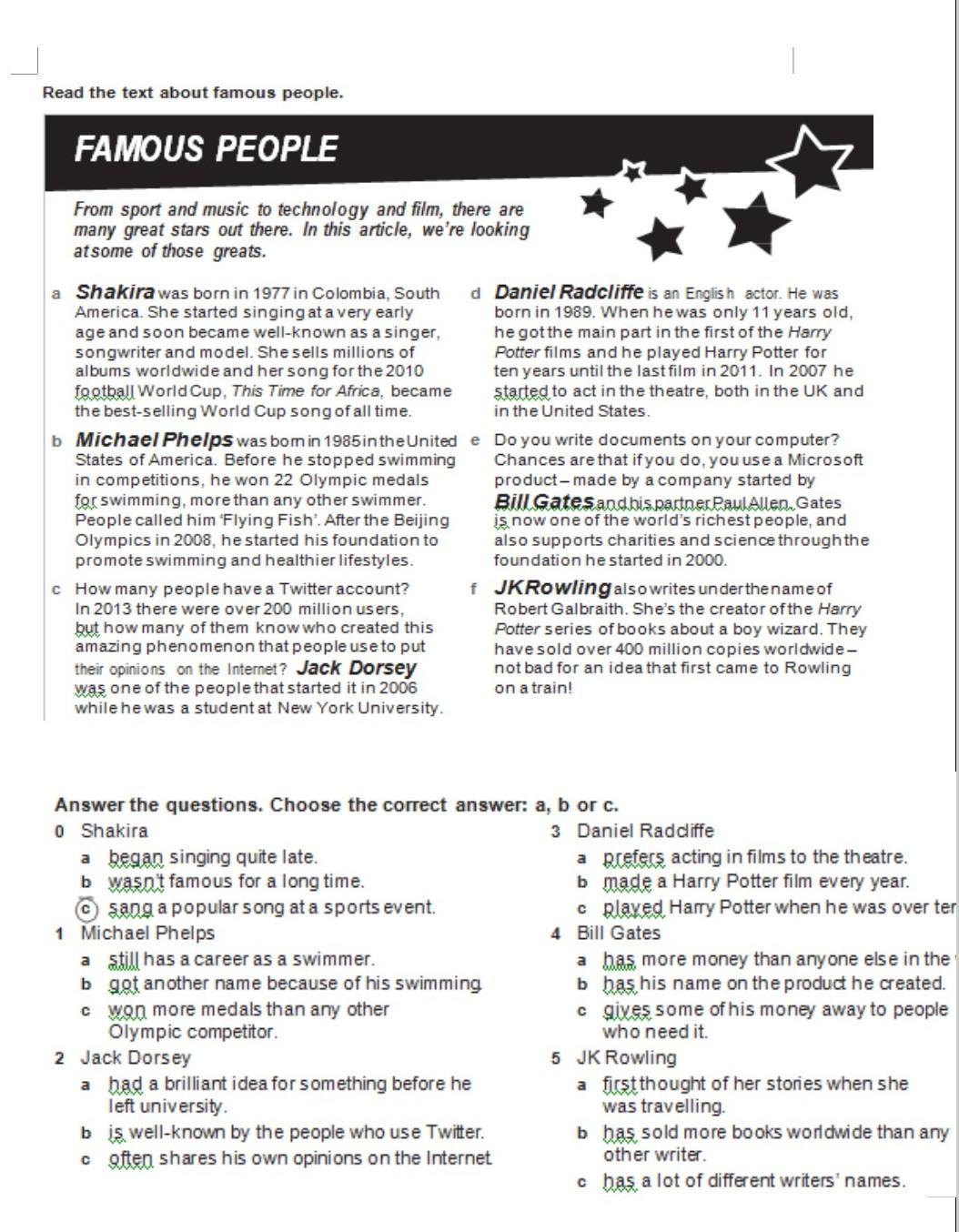 Read the text about famous people. FAMOUS PEOPLE From sport and music to technology and film, there are many great stars out there. In this article, we're looking atsome of those greats. a Shakira was born in 1977 in Colombia, South d Daniel Radcliffe is an English actor. He was America. She started singing at a very early age and soon became well-known as a singer, songwriter and model. She sells millions of albums worldwide and her song for the 2010 football World Cup, This Time for Africa, became the best-selling World Cup song of all time. born in 1989. When he was only 11 years old, he got the main part in the first of the Harry Potter films and he played Harry Potter for ten years until the last film in 2011. In 2007 he started to act in the theatre, both in the UK and in the United States. b Michael Phelps was bom in 1985 in the United e Do you write documents on your computer? States of America. Before he stopped swimming in competitions, he won 22 Olympic medals for swimming, more than any other swimmer. People called him 'Flying Fish'. After the Beijing Olympics in 2008, he started his foundation to promote swimming and healthier lifestyles. Chances are that if you do, you use a Microsoft product-made by a company started by Bill Gates and his partner Paul Allen, Gates is now one of the world's richest people, and also supports charities and science through the foundation he started in 2000. c How many people have a Twitter account? In 2013 there were over 200 million users, but how many of them know who created this amazing phenomenon that people use to put their opinions on the Internet? Jack Dorsey was one of the people that started it in 2006 while he was a student at New York University. Answer the questions. Choose the correct answer: a, b or c. 3 0 Shakira f JKRowling also writes under the name of Robert Galbraith. She's the creator of the Harry Potter series of books about a boy wizard. They have sold over 400 million copies worldwide- not bad for an idea that first came to Rowling on a train! a began singing quite late. b wasn't famous for a long time. Ⓒsang a popular song at a sports event. 1 Michael Phelps a still has a career as a swimmer. b got another name because of his swimming c won more medals than any other Olympic competitor. 2 Jack Dorsey a bad a brilliant idea for something before he left university. b is well-known by the people who use Twitter. c often shares his own opinions on the Internet Daniel Radcliffe a prefers acting in films to the theatre. b made a Harry Potter film every year. c played Harry Potter when he was over te 4 Bill Gates a bas more money than anyone else in the b bas his name on the product he created. c gives some of his money away to people who need it. 5 JK Rowling a first thought of her stories when she was travelling. b has sold more books worldwide than any other writer. c has a lot of different writers' names.
