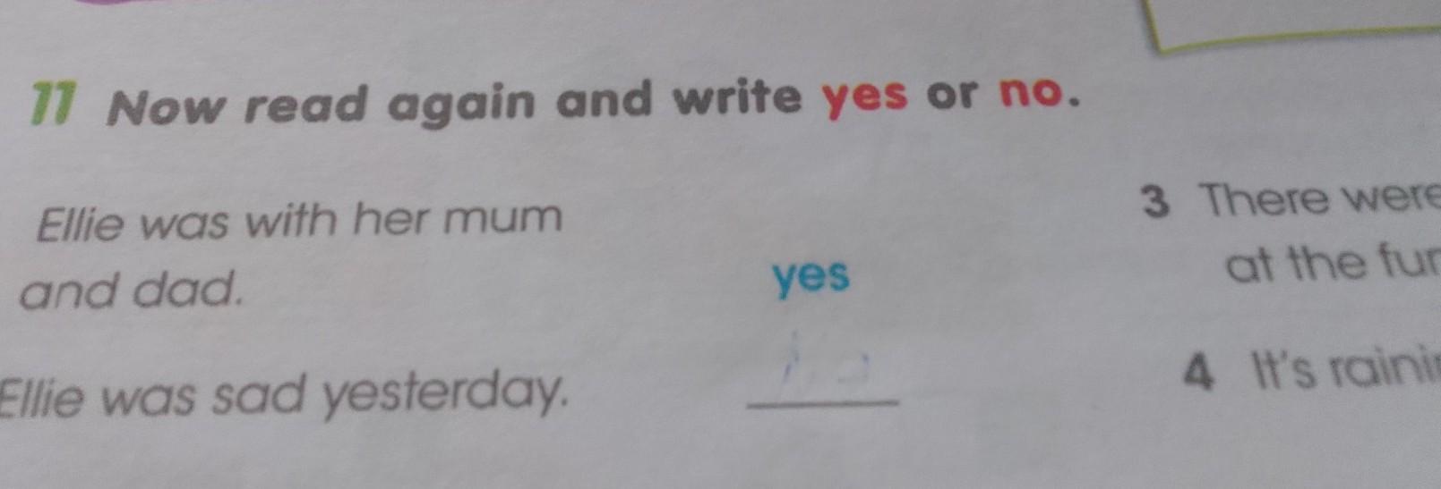 11 Now read again and write yes or no. 1 Ellie was with her mum and dad. 2 Ellie was sad yesterday. yes 3 There weren' at the funfai 4 It's raining to