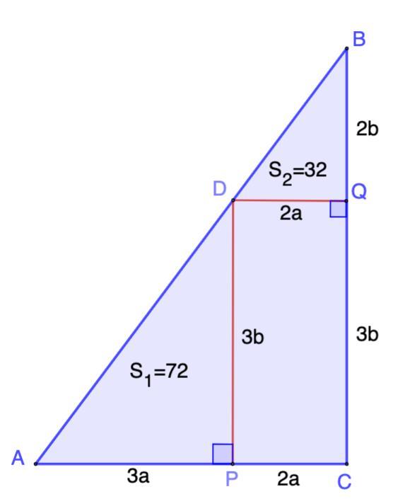 На гипотенузе AB прямоугольного треугольника ABC взята точка D. Из точки D опущены перпендикуляры DP и DQ на стороны AC и BC треугольника ABC. Найдите площадь треугольника ABC, если площади треугольников APD и BQD равны 72 и 32.