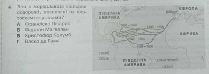 4. Хто з мореплавців здійснив подорожі, позначенi на кар- тосхемi стрілками? А Франсіско Пісарро Б Фернан Магеллан B Христофор Колумб Г Васко да Гама
