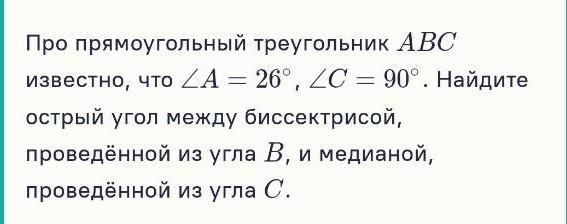 В прямоугольном треугольнике ABC сторона AC является гипотенузой, а стороны AB и BC являются катетами. Также известно, что угол А равен 26°, а угол C равен 90°.