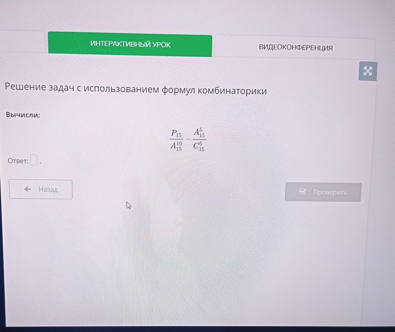 Решение задач с использованием формул комбинаторики Вычисли: Ответ: Назад Д P15 10 А 15 Ais 15 В Про