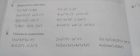 АИЧЕСКИЕ ВЫ Выполните действия. 1) (-5a) . (-4a) 3) (a² b c3)º . (a' b c²) 5) (2,5a7) . (2a") 7) (8a)3 . (5a) . (2a') Умножьте одночлены. 1) (aº)(bº)(a7b8) 4) (1,2x) (1,3x¹0) 2) (-a) . (-a) 4) (alo bº cs)s . (a b8c8)4 6) (-2a² b)² . (-2ab2) 8) (abc3)3 . (ab³ c)+ . (a bc)s 2) (q' b") - (q'3 b) 3) (-5a²) (0,2b²) (-8a'b 5) (2а) (3а²) (4a) (5at) 6) (0,6m²) (0,8n*) 9