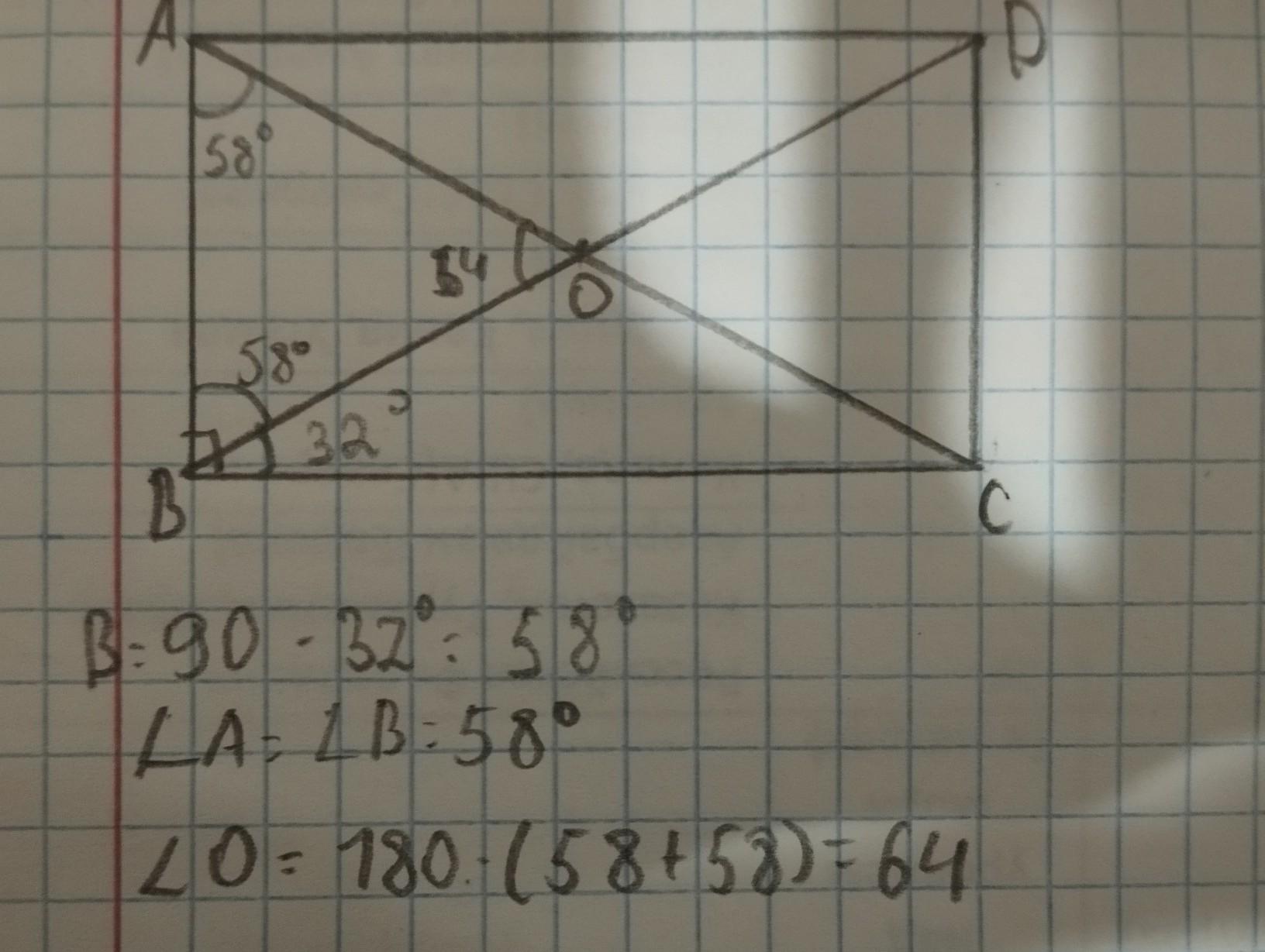 Диагонали прямоугольника ABCD пересекаются в точке O,угол obc=32 градуса,найдите угол AOB