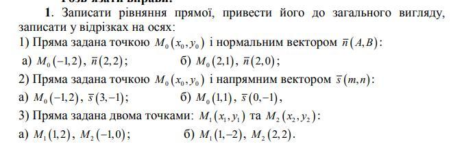 Записати рівняння прямої, привести його до загального вигляду, записати у відрізках на осях