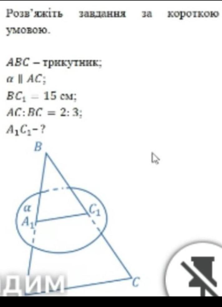 У вас є трикутник ABC, де відрізок AC паралельний відрізку A1C1. Довжина ВС1 дорівнює 15 см. Відомо, що відношення довжини відрізка AC до довжини відрізка ВС є 2:3 (AC:ВС = 2:3).
