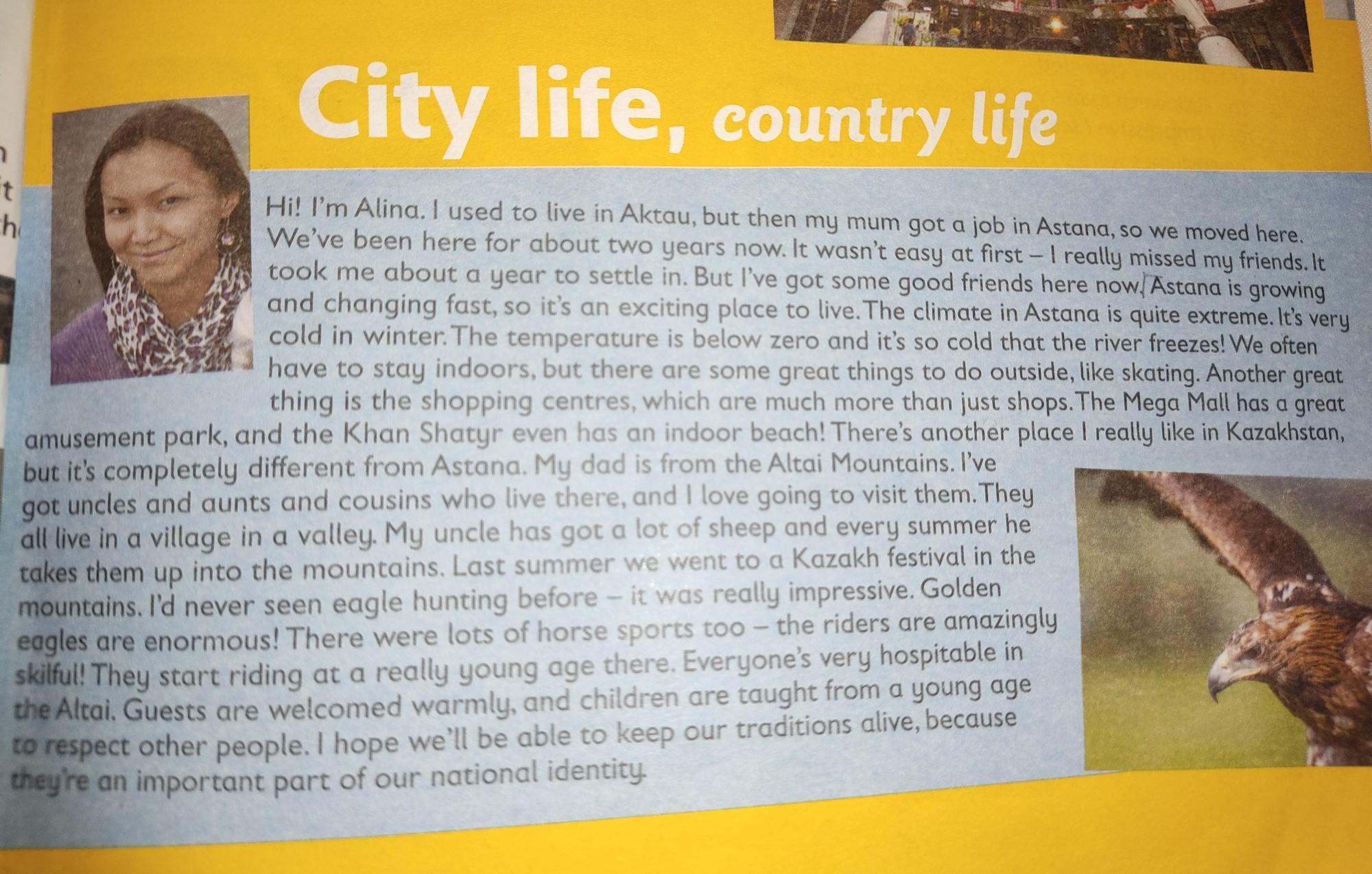 Hi! I'm Alina. I used to live in Aktau, but then my mum got a job in Astana, so we moved here. We've been here for about two years now. It wasn't easy at first I really missed my friends. It took me about a year to settle in. But I've got some good friends here now, Astana is growing and changing fast, so it's an exciting place to live. The climate in Astana is quite extreme. It's very cold in winter. The temperature is below zero and it's so cold that the river freezes! We often have to stay indoors, but there are some great things to do outside, like skating. Another great thing is the shopping centres, which are much more than just shops. The Mega Mall has a great amusement park, and the Khan Shatyr even has an indoor beach! There's another place I really like in Kazakhstan, but it's completely different from Astana. My dad is from the Altai Mountains. I've got uncles and aunts and cousins who live there, and I love going to visit them. They Out the all live in a village in a valley. My uncle has got a lot of sheep and every summer he takes them up into the mountains. Last summer we went to a Kazakh festival in the . Use th out? mountains. I'd never seen eagle hunting before - it was really impressive. Golden uct? y eagles are enormous! There were lots of horse sports too - the riders are amazingly skilful! They start riding at a really young age there. Everyone's very hospitable in the Altai. Guests are welcomed warmly, and children are taught from a young age to respect other people. I hope we'll be able to keep our traditions alive, because they're an important part of our national identity