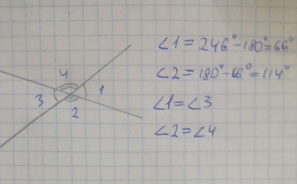 знайдіть градусну міру кожного з кутів які утворилися при перетині двох прямих якщо сума 3 кутів = 246