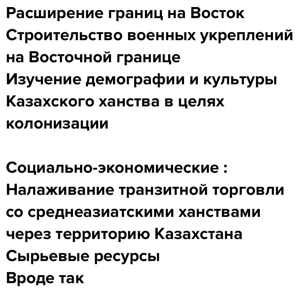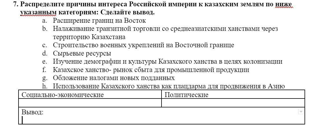 7. Распределите причины интереса Российской империи к казахским землям по ниже указанным категориям: Сделайте вывод. а. Расширение границ на Восток b. Налаживание транзитной торговли со среднеазиатскими ханствами через территорию Казахстана с. Строительство военных укреплений на Восточной границе d. Сырьевые ресурсы е. Изучение демографии и культуры Казахского ханства в целях колонизации f. Казахское ханство- рынок сбыта для промышленной продукции g. Обложение налогами новых подданнЫХ h. Использование Казахского ханства как плацдарма для продвижения в Азию Социально-экономические Политические Вывод: