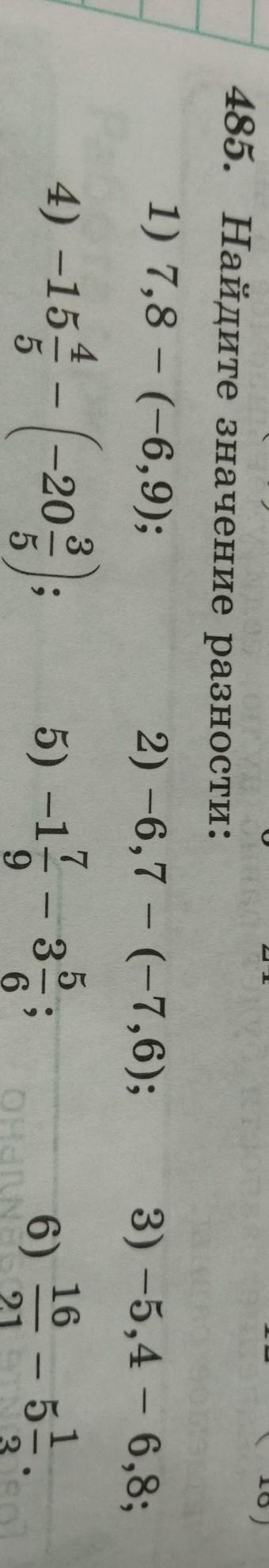 485. Найдите значение разности: 1) 7, 8 - (- 6, 9) 4) - 15 4/5 - (- 20 3/5) 2) - 6, 7 - (- 7, 6) 5) - 1 7/9 - 3 5/6 3) - 5, 4 - 6, 8 6) 16/21 - 5 1/3