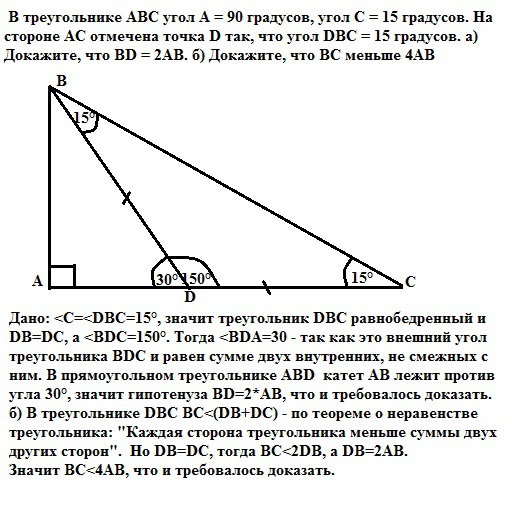 В треугольнике ABC угол A = 90 градусов, угол C = 15 градусов. На стороне AC отмечена точка D так, что угол DBC = 15 градусов. а) Докажите, что BD = 2AB. б) Докажите, что BC меньше 4AB