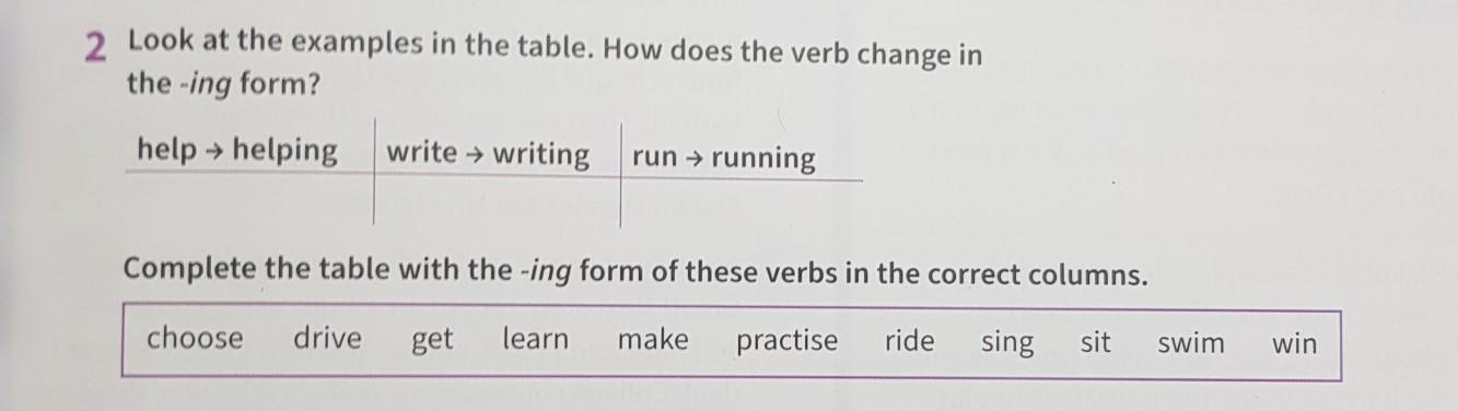2 Look at the examples in the table. How does the verb change in the -ing form? help → helping write → writing run → running Complete the table with the -ing form of these verbs in the correct columns. get drive learn choose make practise ride sing sit swim win