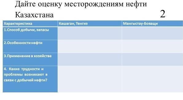 Дайте оценку месторождениям нефти Казахстана Характеристика 1.Способ добычи, запасы 2.Особенности нефти 3.Применение в хозяйстве 4. Какие трудности и проблемы возникают в связи с добычей нефти? Кашаган, Тенгиз Мангыстау-Бозащи