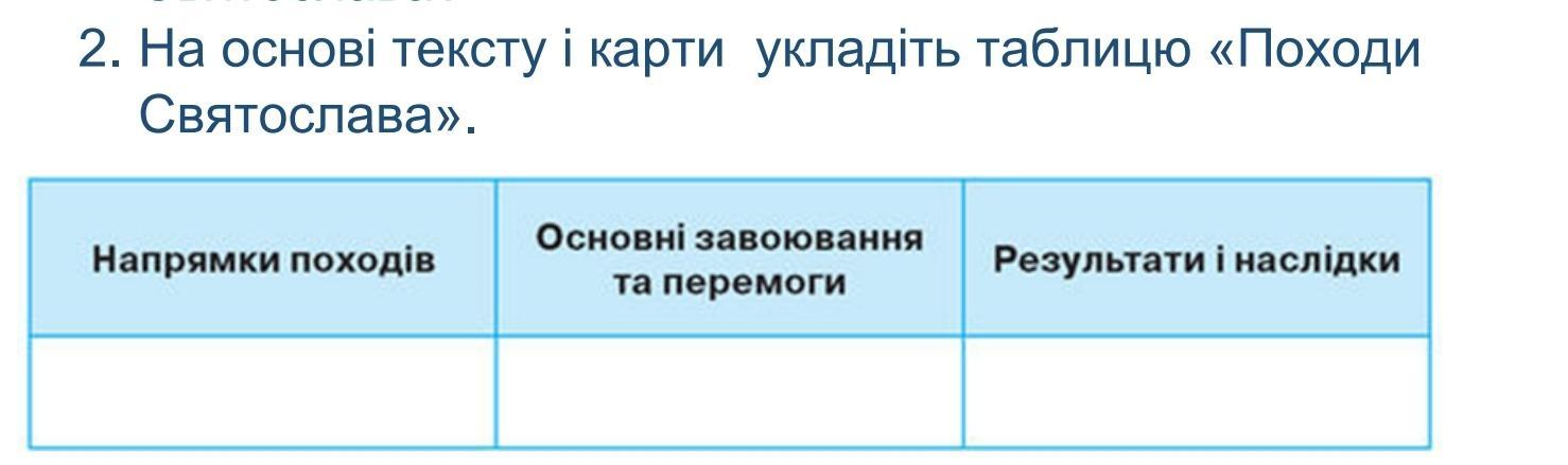 1. Первый — на вятичей, Поволжье, Придонские и Прикубанские земли, второй — на булгар и буртасов в Среднем Поволжье и хазар в Нижнем Поволжье.