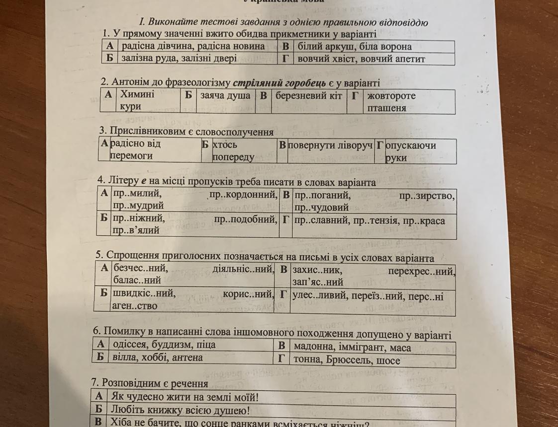 Відповідь: 1.а; 2.г; 3.а; 4.в; 5.г; 6.б; 7.г