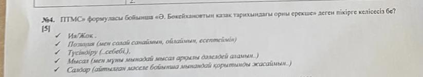 4. ПТМС, формуласы бойынша «Ә. Бөкейхановтын казак тарихындагы орны ерекше» деген пiкiрге келісесіз бе?