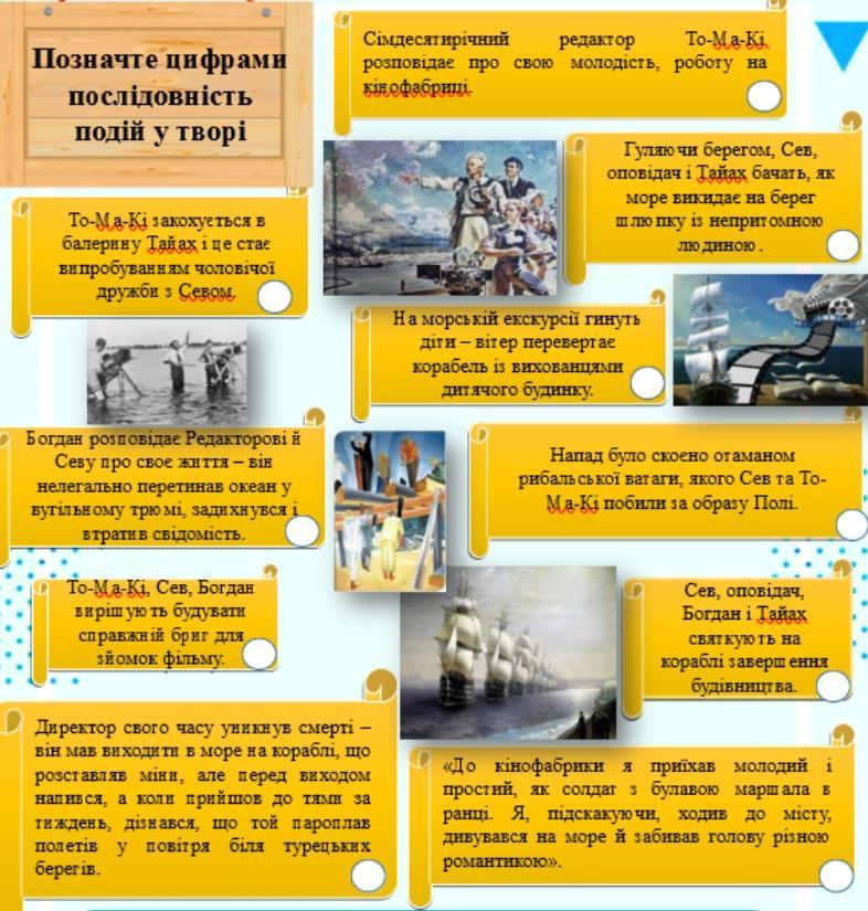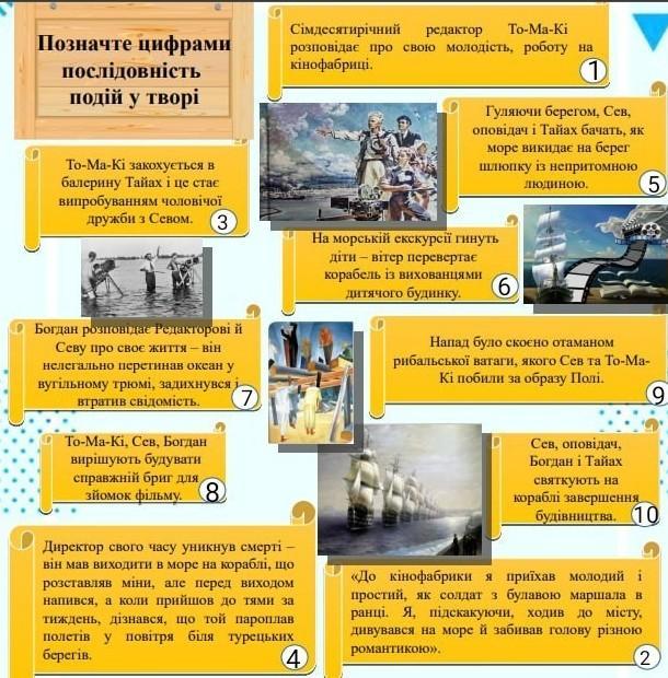 Юрій Яновський "майстер корабля". Позначте цифрами послідовність подій у творі, 34 бали!