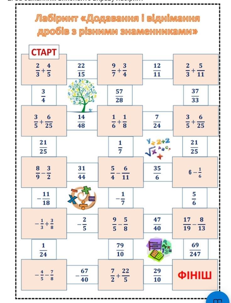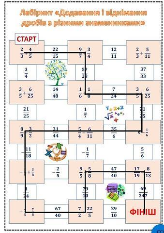 Пройдіть лабіринт "Додавання і віднімання дробів з різними знаменниками" 6 класс