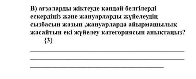 B) ағзаларды жіктеуде қандай белгілерді ескердiнiз және жануарларды жүйелеудің сызбасын жазып ,жануарларда айырмашылық жасайтын екi жүйелеу категориясын анықтаңыз? {3}