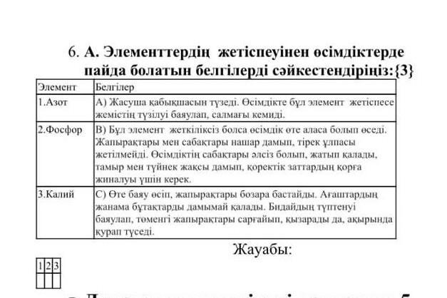 6. А. Элементтердің жетіспеуiнен өсімдіктерде пайда болатын белгілерді сәйкестендіріңіз:{3} Элемент Белгiлер 1.Азот 2.Фосфор В) Бұл элемент жеткіліксіз болса есiмдiк ете аласа болып еседі. Жапырактары мен сабактары нашар дамып, тiрек улпасы жетiлмейдi. Өсiмдiктiн сабактары әлсiз болып, жатып калады. тамыр мен түйнек жаксы дамып, коректік заттардын корга жиналуы үшiн керек. 3.Калий Н А) Жасуша қабықшасын түзеді. Өсімдікте бұл элемент жетіспесе жемiстiн түзiлуi баяулап, салмагы кемиді. С) Өте баяу өсiп, жапырактары бозара бастайды. Ағаштардын жанама бутактарды дамымай қалады. Бидайдын түптенуi баяулап, теменгi жапырақтары сарғайып, кызарады да, акырында курап түседi. Жауабы: